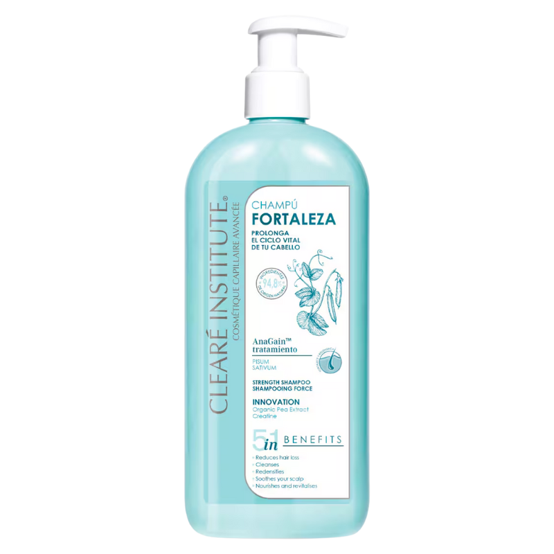El champú Fortaleza Anticaída de Clearé Institute está formulado con ingredientes naturales y ecológicos que limpian, nutren y fortalecen el cabello. Ayuda a frenar la caída y estimula el crecimiento del cabello. Contiene un 96,7% de ingredientes de origen natural y está diseñado para prolongar el ciclo de vida del cabello, ofreciendo mayor volumen, salud y facilidad de peinado. Su fórmula incluye AnaGain, un extracto de guisante orgánico y creatina. Proporciona cinco beneficios: reduce la caída en un 85%, estimula el crecimiento del cabello, redensifica en un 56%, calma el cuero cabelludo y revitaliza el cabello. Se aplica sobre el cabello mojado o ligeramente húmedo, se masajea durante dos minutos y se aclara.