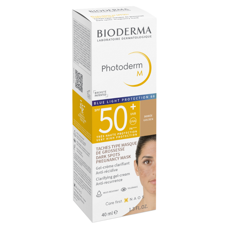 BIODERMA Photoderm M SPF50+ Dorado es un protector solar con color de muy alta protección, diseñado para pieles sensibles con hiperpigmentación, como melasma o manchas solares, ideal para adultos. Su fórmula, con el complejo Cellular Bioprotection™ y glabridina, ofrece protección de amplio espectro contra rayos UVA/UVB, reduce las manchas existentes y previene su aparición, mientras su tono dorado unifica el cutis con un acabado mate.
