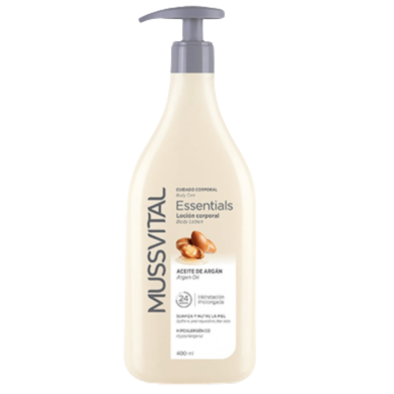 MUSSVITAL ESSENTIALS LOCION ACEITE ARGAN 400 ML es una loción que hidrata y nutre la piel del cuerpo. Es hipoalergénico y apto para todo tipo de pieles.