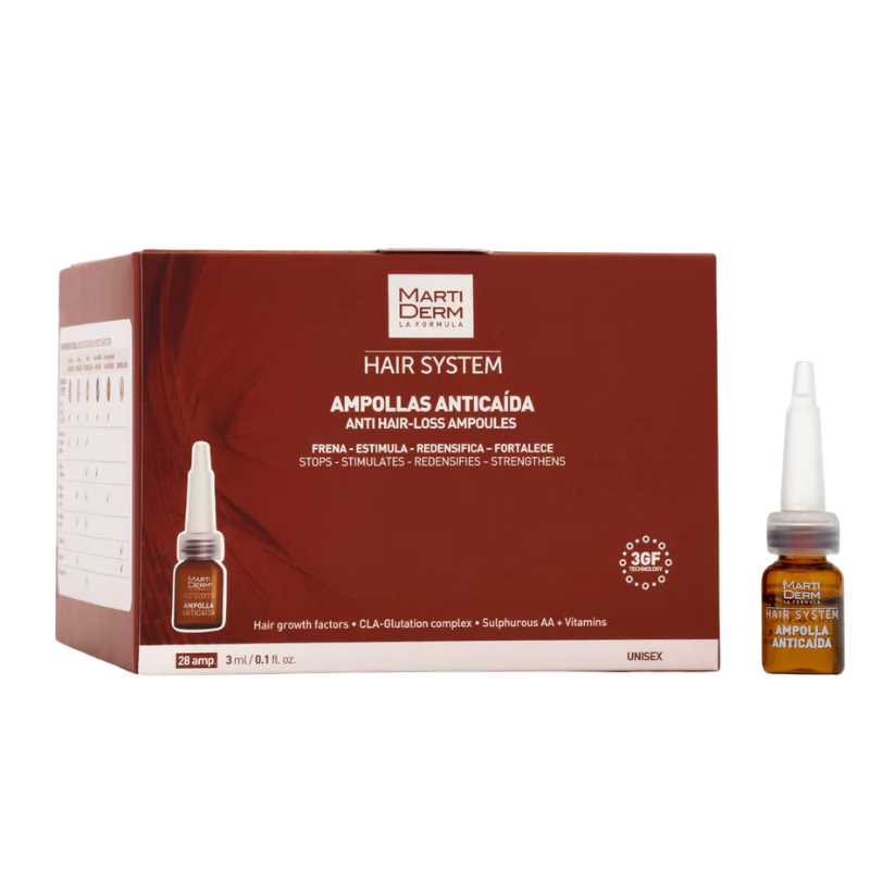 Ampollas Anticaída frenan el proceso de caída, estimulan el crecimiento de nuevos cabellos, aumentan la densidad y mejoran el anclaje al cuero cabelludo, gracias a que contienen tres factores de crecimiento, biotinil, ácido oleanoico, apigenina y un complejo vitamínico, entre otros ingredientes. El cabello vuelve a recuperar su fuerza y densidad.