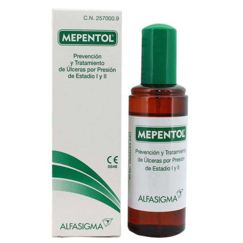 Tratamiento de Úlceras por Presión de Estadio II: Después de haber efectuado las curas de limpieza habituales, aplicar directamente Mepentol sobre la úlcera, o bien pulverizar sobre una gasa estéril, que se aplica después sobre la úlcera. Cubrir la úlcera con la ayuda de un vendaje apropiado. Repetir la aplicación 2 ó 3 veces al día hasta la completa cicatrización. Para esta operación se aconseja el uso de guantes.