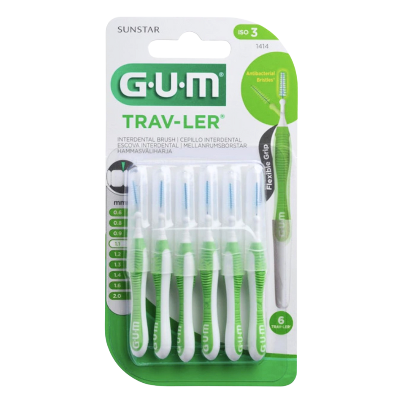 Características particulares: mango de material elastómero antideslizante de color verde. Se dobla por el cuello para alcanzar zonas de difícil acceso. Tamaño adecuado a espacios interdentales de hasta 1.1 mm según norma ISO 3. Presentación: un blister que contiene 6 cepillos interdentales + 6 capuchones.