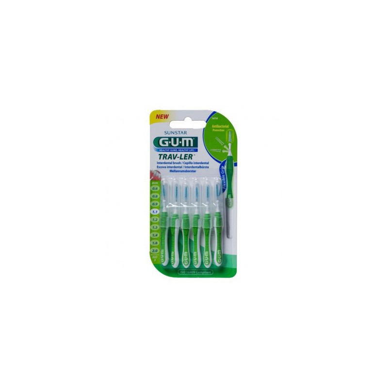 Tipo de cepillo:interdentalTamaño: muy pequeñoForma de la cabeza: escobilla cónicaMaterial de las fibras: nylonNúmero de filas y/o filamentos: filamentos sujetos a un eje central de alambre trenzado de acero inoxidable. Diámetro filamento 0.05 mm. Diámetro del alambre 0.275 mm. Diámetro de la escobilla 2.3-3.8 mm. Longitud del cabezal 10 mm. Filamentos recubiertos con clorhexidina para mantener su higiene entre usos. La clorhexidina no se libera en boca.Número de penachos por fila: no hay penachosDureza: suaveCaracterísticas particulares: mango de material elastómero antideslizante de color verde. Se dobla por el cuello para alcanzar zonas de difícil acceso. Tamaño adecuado a espacios interdentales de hasta 1.1 mm según norma ISO 3. Presentación: un blister que contiene 6 cepillos interdentales + 6 capuchones.