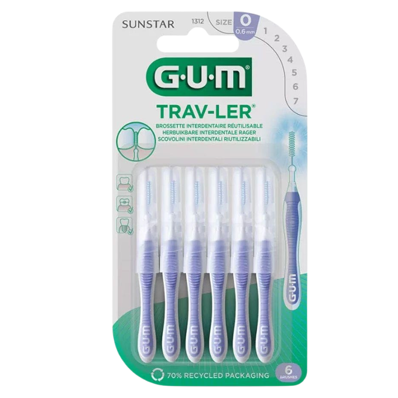 Características particulares: mango de material elastómero antideslizante. Se dobla por el cuello para alcanzar zonas de difícil acceso. Tamaño adecuado a espacios interdentales de hasta 0,6 mm según norma ISO 0. Un blister contiene 6 cepillos interdentales + 6 capuchones.
