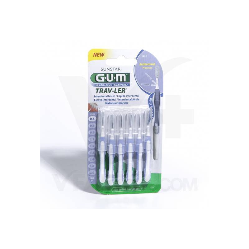 Tipo de cepillo:interdentalTamaño: muy pequeñoForma de la cabeza: escobilla cilíndricaMaterial de las fibras: nylonNúmero de filas y/o filamentos:filamentos sujetos a un eje central de alambre trenzado de acero inoxidable. Diámetro filamento 0.05 mm. Diámetro del alambre 0.18 mm. Diámetro de la escobilla 2,16 mm. Longitud del cabezal 10 mm. Filamentos recubiertos con clorhexidina para mantener su higiene entre usos. La clorhexidina no se libera en boca.Número de penachos por fila: no hay penachosDureza: suaveCaracterísticas particulares: mango de material elastómero antideslizante. Se dobla por el cuello para alcanzar zonas de difícil acceso. Tamaño adecuado a espacios interdentales de hasta 0,6 mm según norma ISO 0. Un blister contiene 6 cepillos interdentales + 6 capuchones.