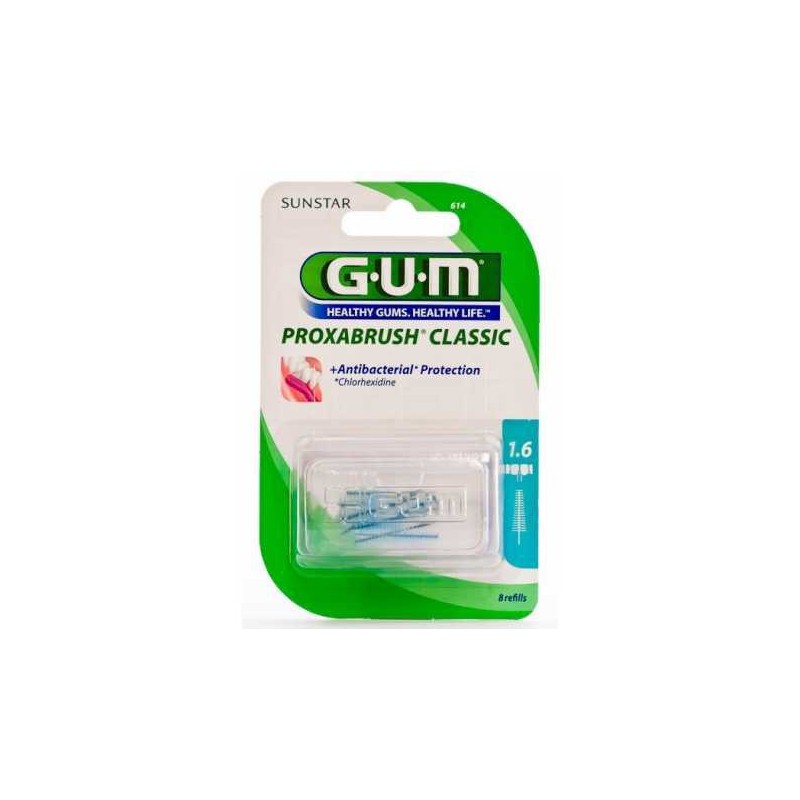 Tipo de cepillo: interdentalTamaño: muy pequeñoForma de la cabeza: escobilla cónicaMaterial de las fibras: nylonNúmero de filas: filamentos sujetos a un eje central de alambre trenzado de acero inoxidable. Diámetro filamento 0,08 mm. Diámetro del alambre 0,7 mm. Diámetro de la escobilla 3,5-6,5 mm. Longitud del cabezal 12,8 mm. Filamentos recubiertos con clorhexidina para mantener su higiene entre usos. La clorhexidina no se libera en la boca. Dureza: suaveCaracterísticas particulares: tamaño adecuado a espacios interdentales de hasta 1,6 mm según norma ISO 5. La escobilla se utiliza como cabezal del mango GUM 605 Proxabrush.