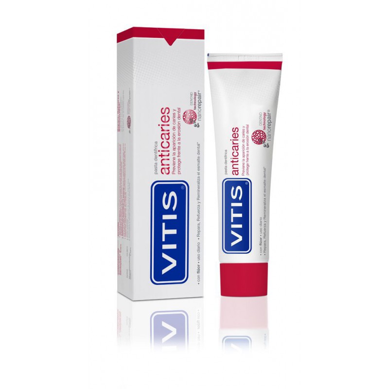 Vitis Anticaries Pasta Dentífrica 100 Ml. Pasta dentífrica apto para el uso diario. Aporta una prevención a tres niveles la aparición de la caries. Repara, refuerza y remineraliza el esmalte.