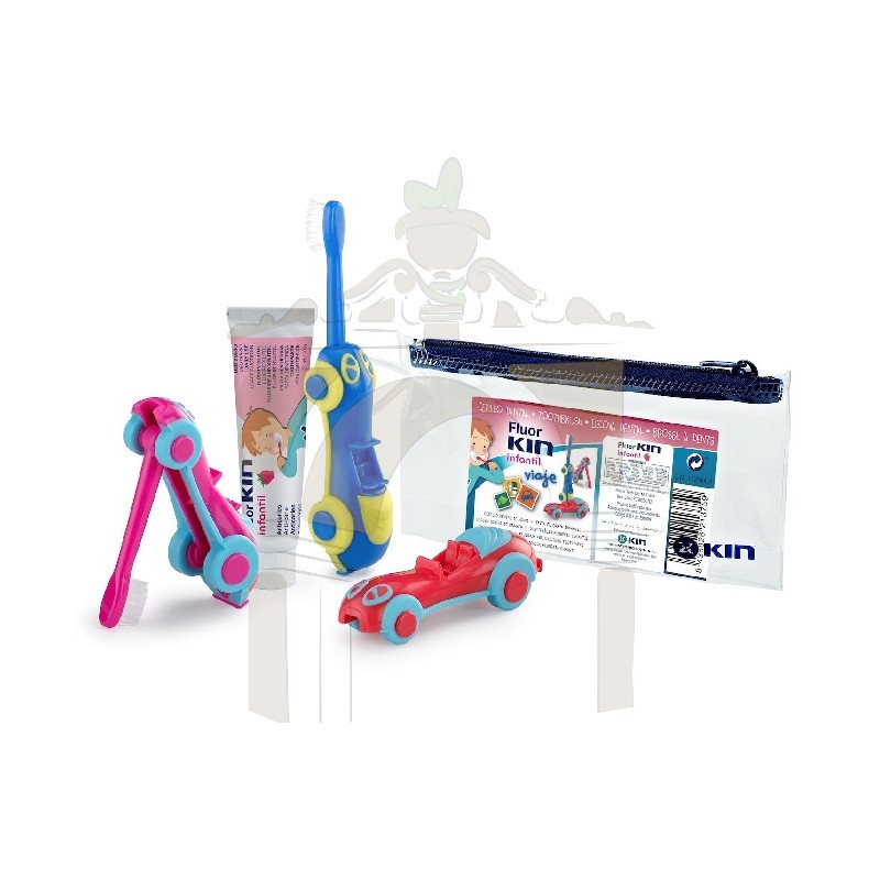 Incluye, dentro de un práctico neceser, el dentífrico FluorKIN Infantil sabor fresa que protege contra la caries y refuerza el esmalte.