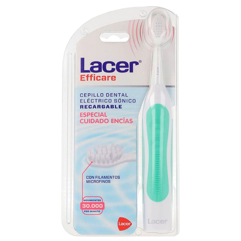 Lacer Sónico Efficare es un cepillo eléctrico dental de tamaño medio con cabeza en forma de diamante y fibras PBT de dureza suave.