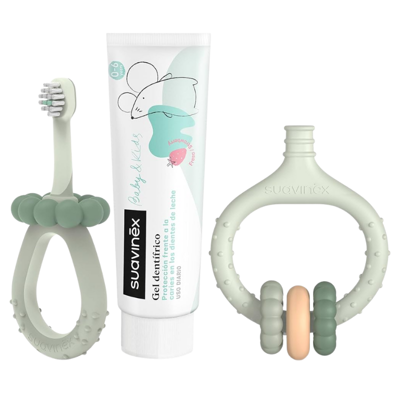 - Además, el set incluye un masajeador de encías, una herramienta perfecta para aliviar las molestias que experimentan los bebés durante la erupción dental. Este masajeador está diseñado para ser suave al tacto, proporcionando un alivio reconfortante y estimulando las encías de forma segura.