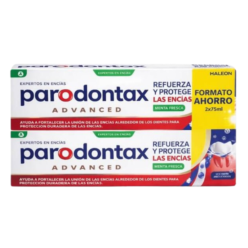 Pasta de dientes con fluor, refuerza y protege las encias. Sabor menta fresca. Contiene 2 envases de 75 ml cada uno.