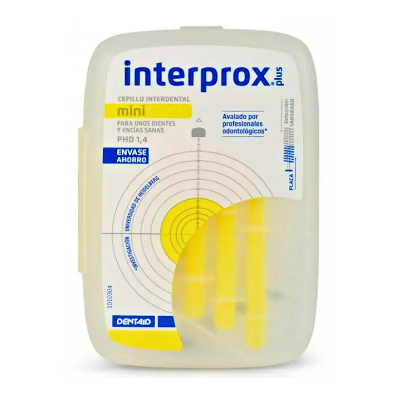 Tipo de cepillo: Interdental.Forma de la cabeza: Cilíndrica. (Interprox plus: maxi y micro) o Nano, super micro Cónica (206896)Material de las fibras: Eje central de acero inoxidable recubierto. Filamento de Tynex.Dureza: Suave.Características particulares: Cepillo interdental para la limpieza de espacios muy pequeños. Parte superior del mango en ángulo. Mango corto.Limpian entre espacios y permiten detectar puntos de sangrado (filamentos blancos) y zonas con placa bacteriana (filamentos negros).