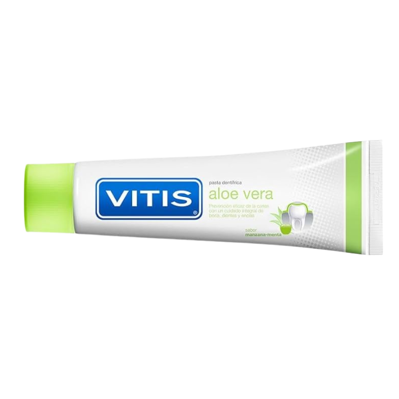 VITIS® aloe vera pasta dentífrica sabor manzana-menta es una pasta dentífrica de uso diario formulada especialmente para prevenir la caries, ya que reduce eficazmente la placa bacteriana y remineraliza el esmalte dental.