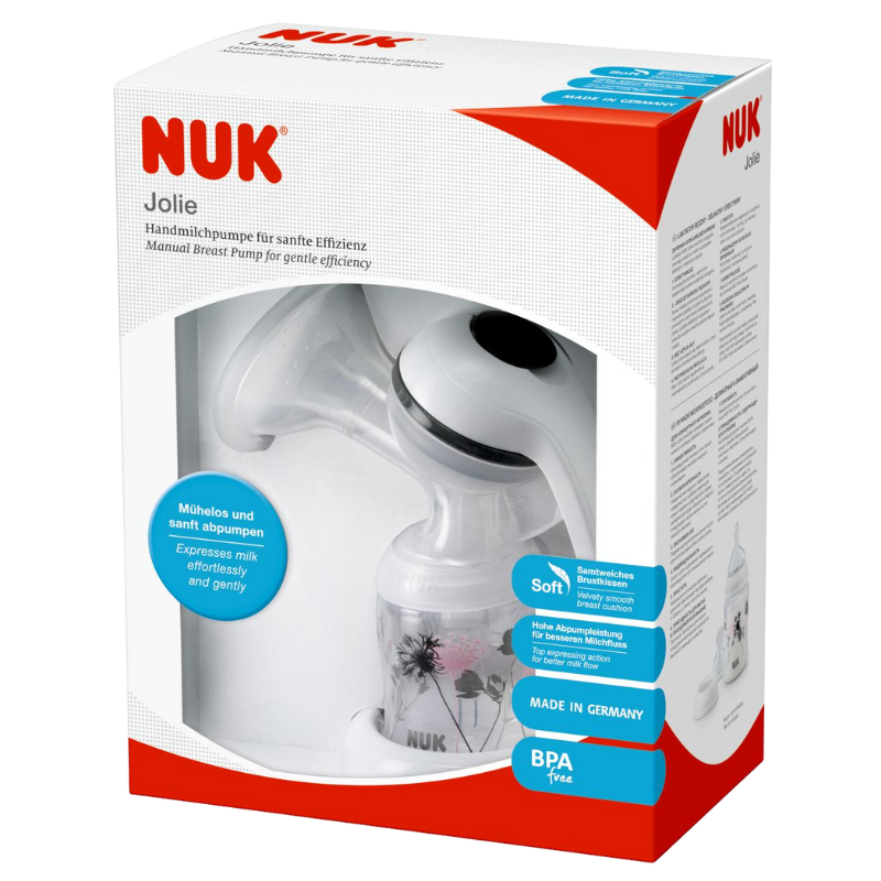 El Sacaleches Manual Jolie NUK ofrece un movimiento de extracción suave y agradable y es idóneo para un uso ocasional.
