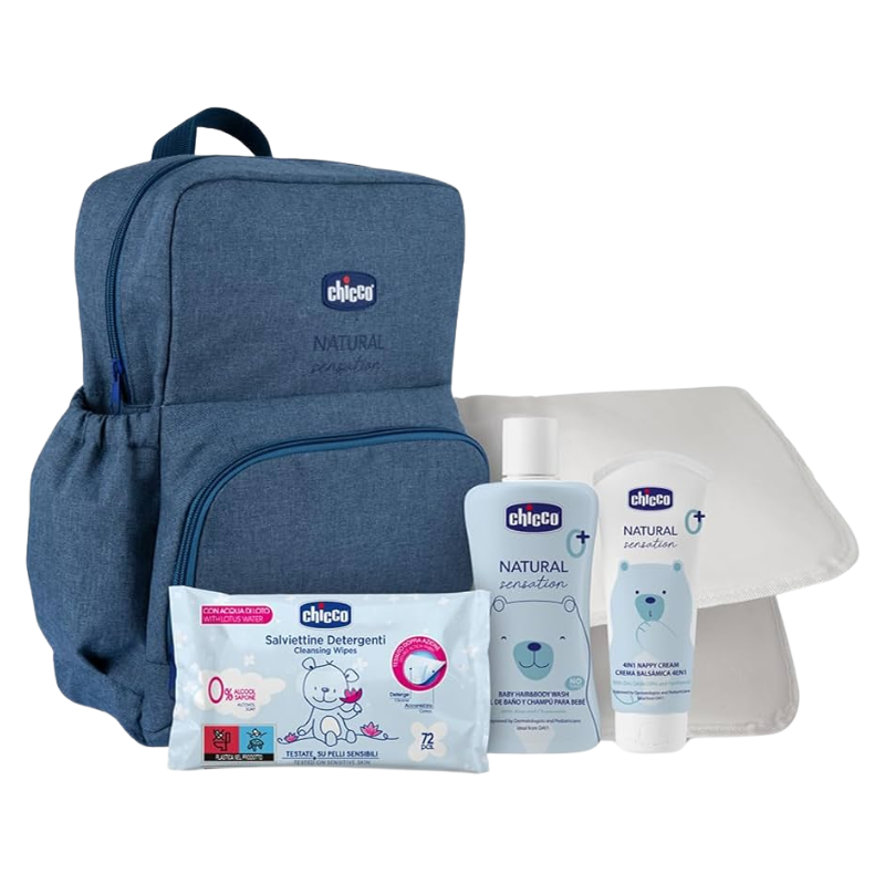 Mochila de paseo para bebé, en tela vaquera con 3 productos de la gama Natural Sensation y un cambiador, perfecta para llevar los básicos de cuidado de tu bebé. Esta bonita mochila es ideal para regalar, incluye un kit de higiene y cuidado para el bebé, además un útil cambiador para cambiar a tu bebé en cualquier sitio.