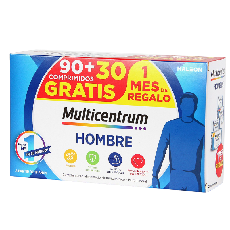 Multicentrum Hombre Pack 90+30 comprimidos es un complemento alimenticio, con 13 vitaminas y 10 minerales, indicado para satisfacer las necesidades nutricionales específicas de los hombres, a partir de los 18 años. Además de poseer una acción antioxidante y contribuir al buen funcionamiento del sistema inmune, así como del corazón, disminuye a su vez la sensación de cansancio y fatiga.