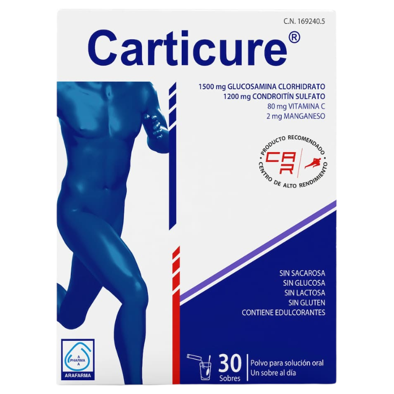 Carticure es un complemento alimenticio formulado con Glucosamina y condroitín sulfato, componentes naturales del cartíulago, que presentan un efecto sinérgico condroprotector. A demás, su fórmula está enriquecida con vitamina C y manganeso, en las cantidades diarias recomendadas para la correcta formación de colágeno y protección articular frente al estrés oxidativo.