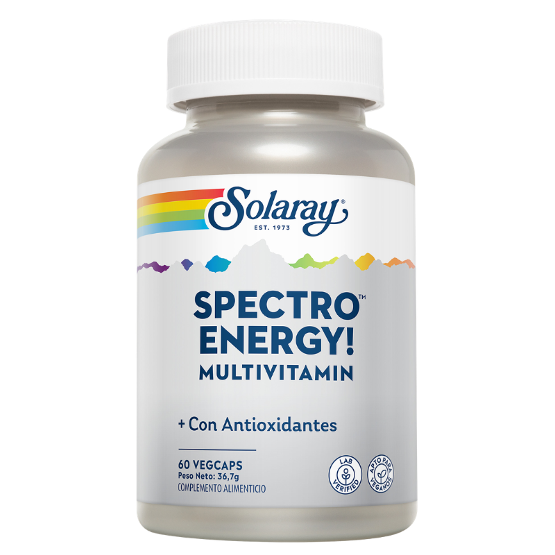 Solaray Spectro Energy 60 Cápsulas. Aporta más de 80 ingredientes para un máximo apoyo nutricional. La fórmula, 100% vegetal, aporta todas las vitaminas y minerales, incluyendo los coenzimas de las vitaminas y minerales quelados. También incorpora importantes antioxidantes como la luteína, el licopeno, el CoQ10 y el ácido alfa lipoico, así como bioflavonoides, enzimas digestivas y pectina, alimentos ricos en clorofila y complejo herbario. Los nutrientes de Spectro Energy aportan un apoyo nutricional para unos renovados niveles de energía y un estilo de vida activo.