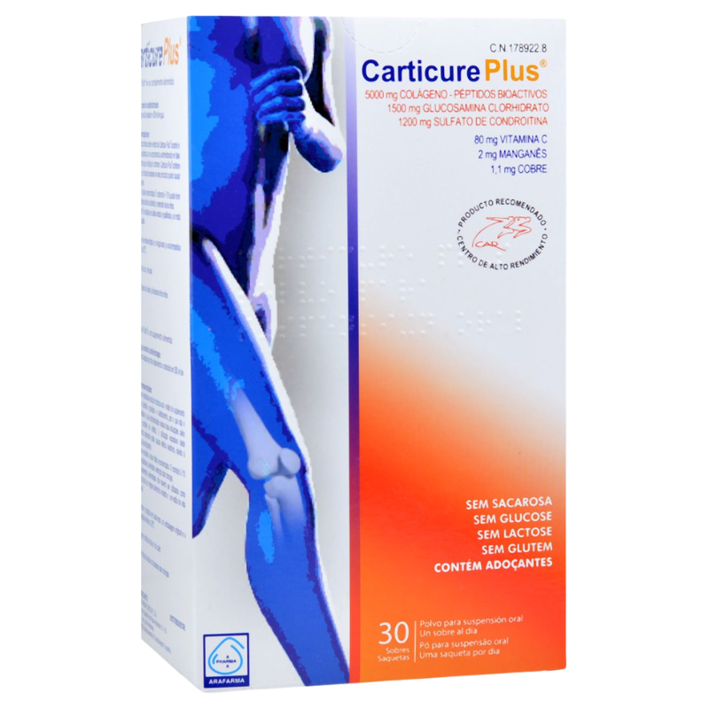 Carticure Plus combina glucosamina, condroitín sulfato y colágeno, componentes naturales del cartílago, que presentan un efecto sinérgico condroprotector. Después de los 30 años se produce un déficit de la síntesis de estas moléculas en el organismo, así como en determinadas situaciones como: personas que realizan algún tipo de ejercicio físico, gente con sobrepeso, mujeres menopáusicas, etc. Esta fórmula Plus está diseñada para aquellos que le exigen un mayor desgaste a las articulaciones, como los deportistas de alto rendimiento, gente de avanzada edad con una actividad regular o gente con mucho sobrepeso y hábitos sedentarios poco saludables.