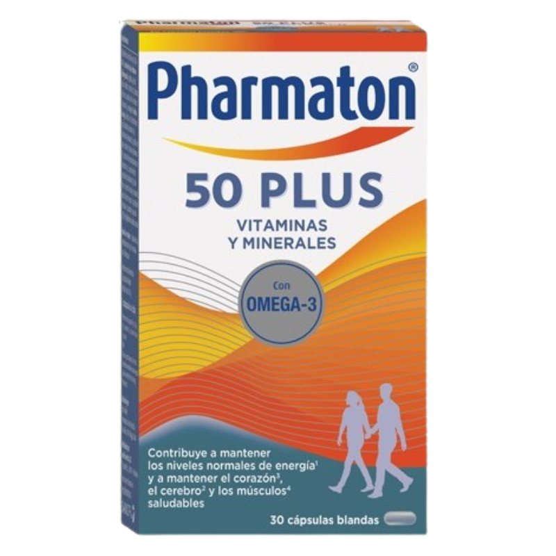 Pharmaton® 50 Plus contiene vitaminas, minerales y ácidos grasos esenciales Omega-3 (DHA y EPA).