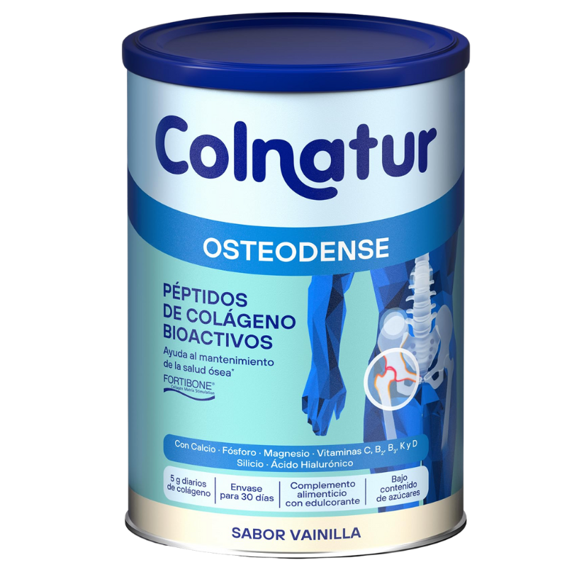 Complemento alimenticio con edulcorante a base de péptidos bioactivos enriquecido con calcio y fósforo (procedente de la leche), magnesio, vitaminas C, B2, B3, K2, D3, silicio (extracto de bambú) y ácido hialurónico que ayuda a los procesos de síntesis y mineralización de los huesos.