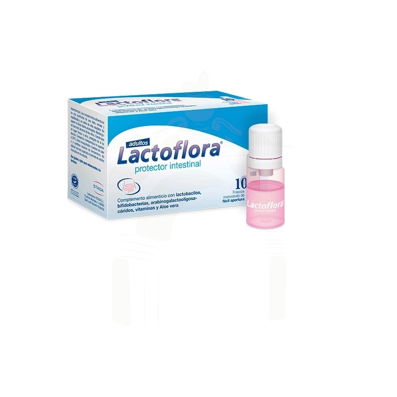 Complemento alimenticio con lactobacilos, bifidobacterias, arabinogalactooligosacáridos, vitaminas y aloe vera.