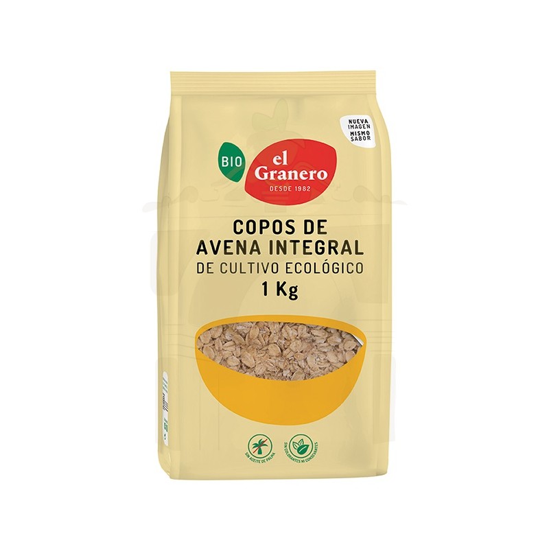 Copos de Avena Integrales Bio de El Granero Integral es un producto elaborado a base de copos de avena 100 % procedente de cultivos ecológicos.