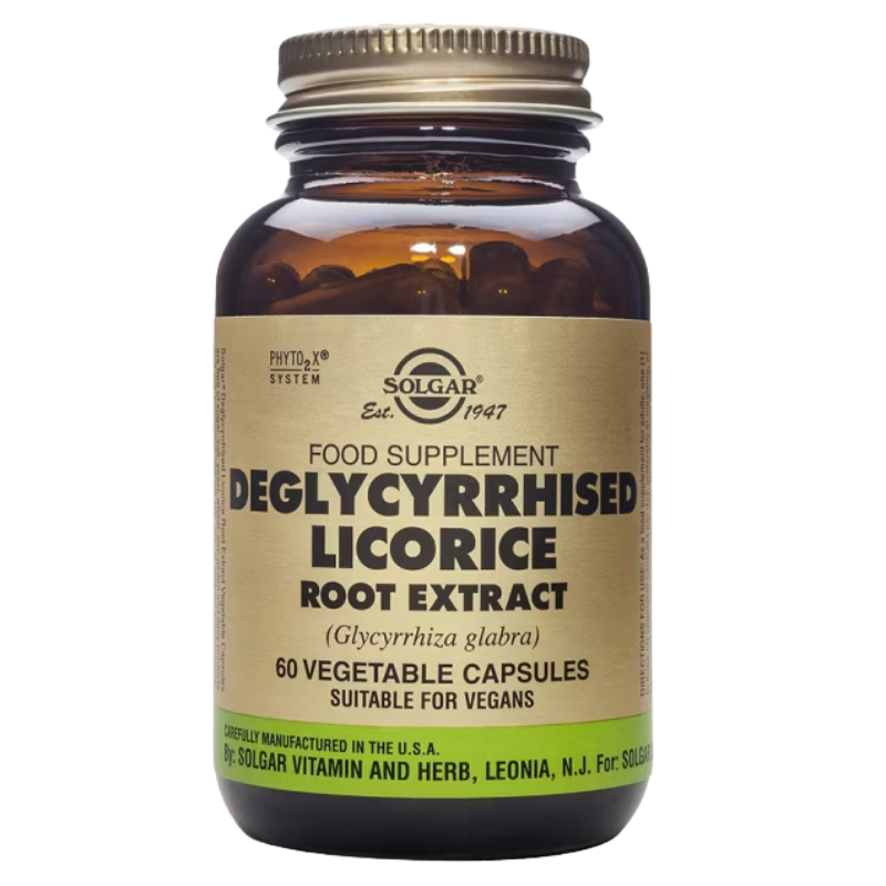 Regaliz Desglicirrizado Extracto de Raíz de Solgar® contiene extracto estandarizado desglicirrizado de raíz de regaliz, con menos del 1% de glicirricina, junto con raíz de regaliz en polvo.