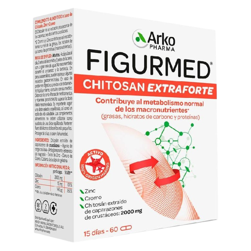 Extracto derivado de caparazones de crustáceos (Chitosan, 500 mg por cápsula), antiaglomerante: estearato de magnesio, cloruro de cromo (celulosa). Cubierta de origen vegetal: hidroxipropilmetilcelulosa, colorantes: dióxido de titanio, óxido de hierro. Por 100 g:Extracto derivado de caparazones de crustáceos: 83,2 g