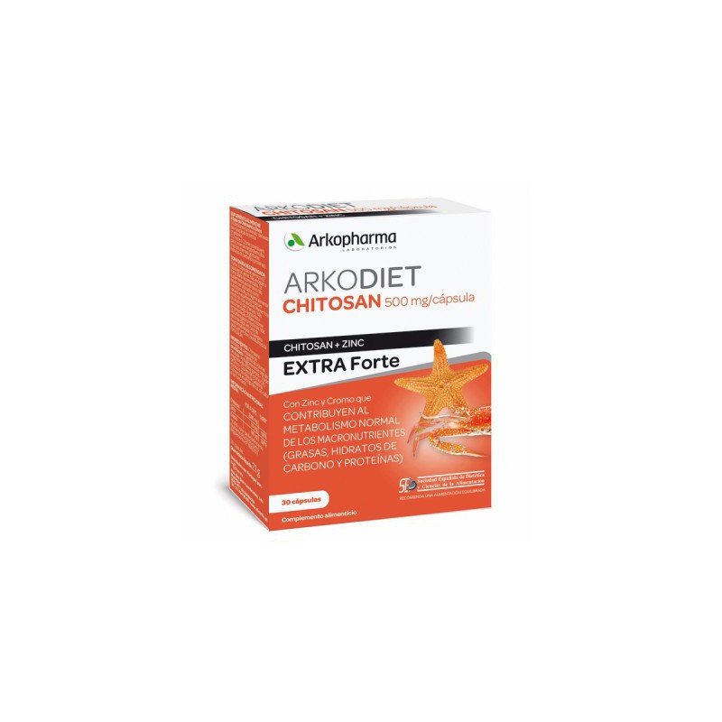 Extracto derivado de caparazones de crustáceos (Chitosan, 500 mg por cápsula), antiaglomerante: estearato de magnesio, cloruro de cromo (celulosa). Cubierta de origen vegetal: hidroxipropilmetilcelulosa, colorantes: dióxido de titanio, óxido de hierro. Por 100 g:Extracto derivado de caparazones de crustáceos: 83,2 g