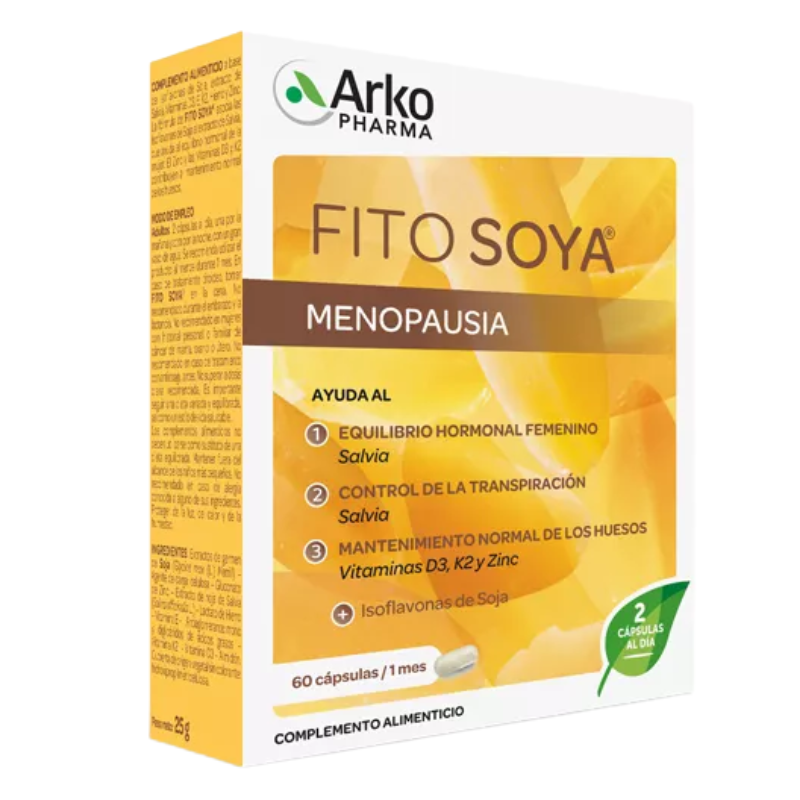 FITO SOYA® asocia las Isoflavonas de Soja al extracto de Salvia(1), reconocida por su acción sobre los sofocos y los sudores nocturnos, que ayuda al equilibrio hormonal de la mujer. El hierro(2) ayuda a disminuir el cansancio y la fatiga. (3) El Zinc y las Vitaminas D3 y K2 contribuyen al mantenimiento normal de los huesos.
