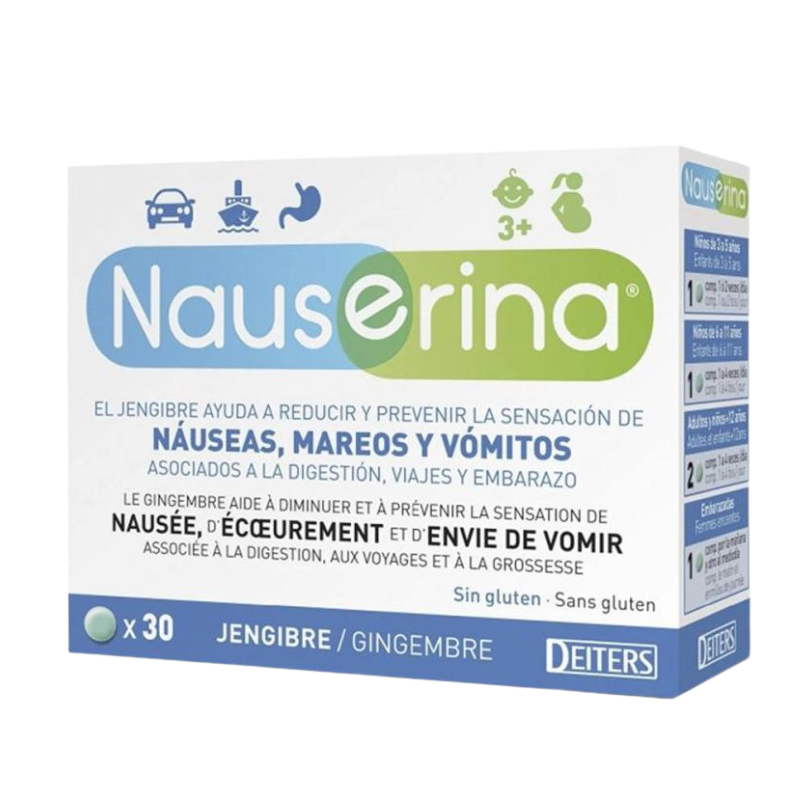 Nauserina es un complemento alimenticio en forma de comprimidos a base de extracto estandarizado de jengibre, con un 10% de gingeroles. Cada comprimido equivale a 500 mg de polvo de raíz de jengibre. El jengibre ayuda a reducir y prevenir la sensación de náuseas, mareos y vómitos asociados a la digestión, viajes y embarazo. Formato: 30 comprimidos.
