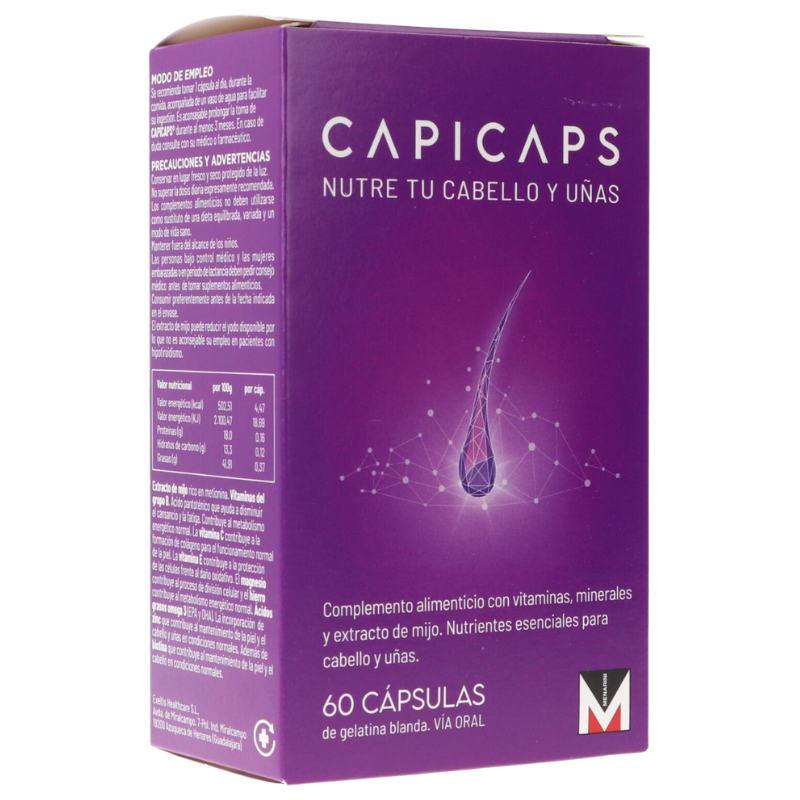 Complemento alimenticio formulado a base de vitaminas, minerales y extracto de mijo perfecto como nutrientes para fortalecer y proteger piel, cabello y uñas. 60 cápsulas.