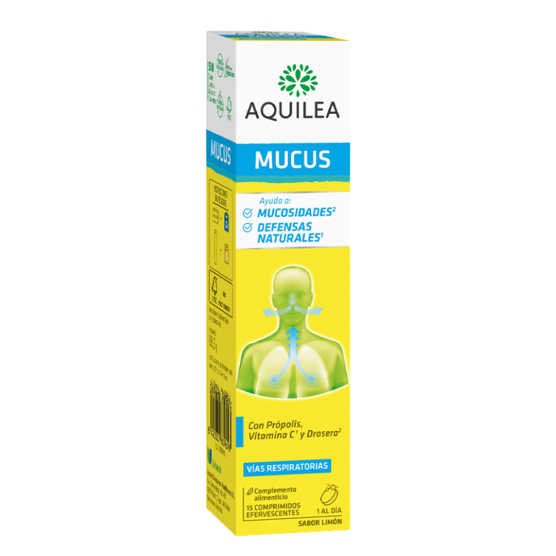 Aquilea Mucus contiene Serratiopeptidasa, N-Acetilcisteína, própolis, vitamina C y Drosera. La vitamina C contribuye al funcionamiento normal del sistema inmunitario y la drosera es una planta que contribuye a mantener el nivel óptimo de mucosidades y a la salud de las vías respiratorias.