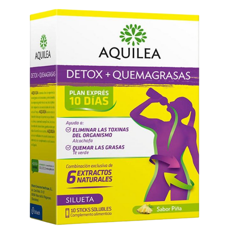 Aquilea Sticks Bebibles Aquilea Detox + Quemagrasas Aquilea Aquilea Detox es un complemento alimenticio que te ayuda a eliminar la toxinas del cuerpo y de la piel, ayuda a dar confort digestivo, ayuda a eliminar líquidos y además contribuye a un efecto quemagrasas. Formato: 10 Sticks Bebibles.