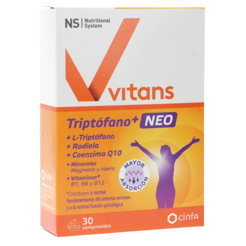 Ns Vitans Triptófano+ Neo es un complemento alimenticio con una innovadora molécula formada por un núcleo de triptófano recubierto por coenzima Q10 altamente biodisponible: