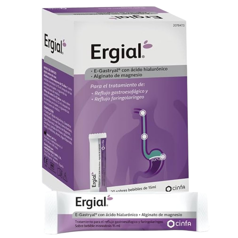 Ergial® ayuda a reducir los síntomas de la enfermedad por reflujo gastroesofágico (ERGE) y del reflujo faringolaríngeo (RFL).