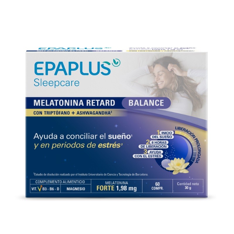 Epaplus Sleepcare Melatonina Retard Balance es un complemento alimenticio a base de melatonina (1,98 mg), ashwagandha, triptófano,