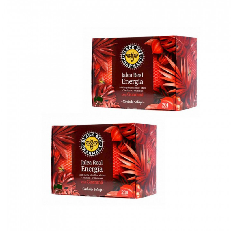 Black Bee Energía combina el poder de la jalea real, el guaraná, la taurina y 5 vitaminas con las propiedades de la maca que contribuye a aportar un extra de energía cuando se necesita y ayuda también al rendimiento físico y mental.