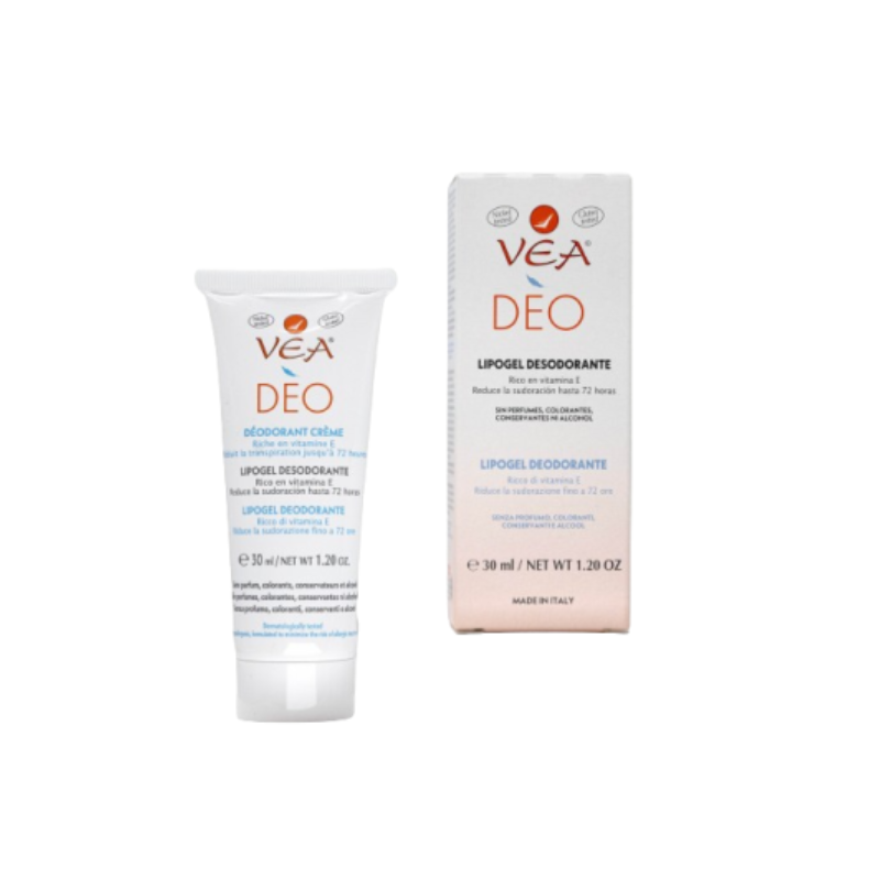 VEA DEO es un lipogel desodorante a base de vitamina E de alta eficacia y tolerabilidad. Reduce la sudoración (test instrumental) y el mal olor asociado (test de olfato) de forma natural, contrarrestando la proliferación de bacterias que se encuentran en su origen. Larga duración: una sola aplicación es efectiva hasta 72 horas. No es pegajoso, no engrasa ni mancha la ropa.