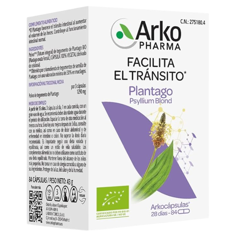 Complemento alimenticio a base de plantago, que puede contribuir al correcto tránsito intestinal al aumentar el volumen de las heces.