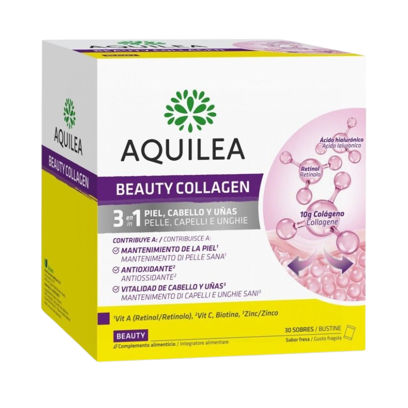 Aquilea Total Beauty 30 Sobres Sabor Fresa es un complemento alimenticio diseñado para cuidar la belleza de la piel, el cabello y las uñas desde el interior. Su fórmula innovadora combina colágeno, ácido hialurónico, vitaminas y minerales esenciales para promover la elasticidad de la piel, fortalecer las uñas y mantener el cabello saludable. Con un delicioso sabor a fresa, es fácil de incorporar en tu rutina diaria.