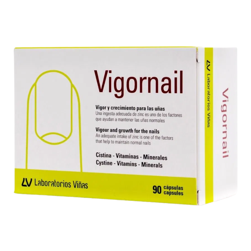 Vigornail 90 Cápsulas es un complemento nutricional para el vigor y crecimiento de las uñas. Es una combinación equilibrada de elementos esenciales para la nutrición de las uñas.Vigornail para 2 cápsulas que es la dosis diaria recomendada está compuesto por: L-cistina 1g. Hierro 14mg. Zinc 10mg. Biotina 50 microgramos. Vitamina D 5 microgramos. El Zinc, con una ingesta adecuada es uno de los factores que ayudan a mantener las uñas en condiciones óptimas. La L-cistina es un aminoácido azufrado constitutivo de la queratina.Vigornail, la dosis diaria recomendada es de 2 cápsulas al día con un vaso de agua u otro líquido preferentemente con las comidas y durante un mínimo de 2 meses.