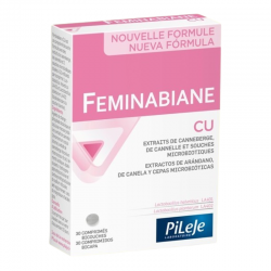 Feminabiane Confort Urinario de Pileje es un suplemento dietético a base de extractos de arándanos, canela y cepas microbianas.