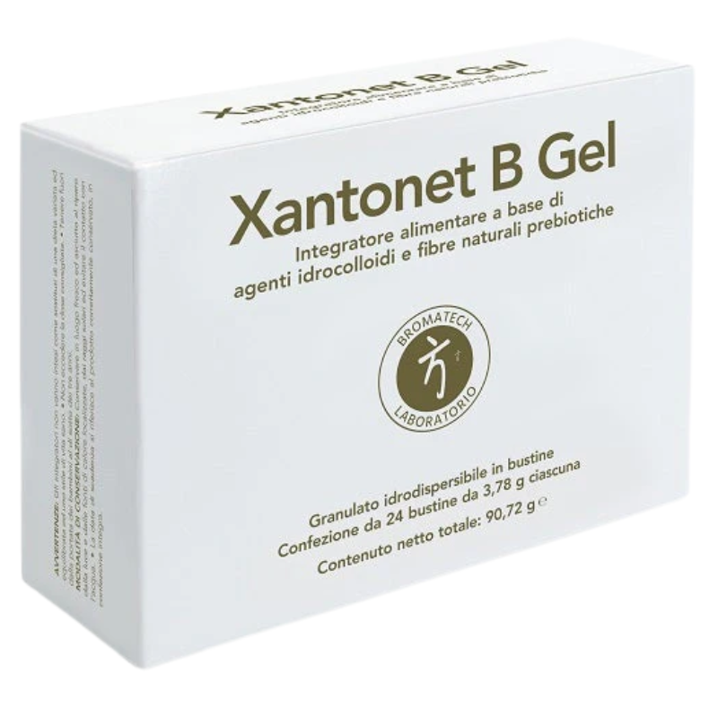 Xantonet B Gel de Bromatech es un complemento alimenticio a base de agentes hidrocoloides y fibras prebióticas naturales, formulado para complementar la dieta en casos de tránsito lento y para apoyar la función intestinal. Su composición incluye α-gluco-oligosacáridos, goma de acacia, pulpa de baobab, goma guar, inulina y malva.